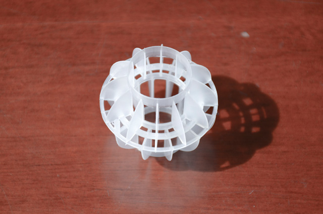 多面空心球中間鏤空結(jié)構(gòu)形成空隙大,不易被阻塞的特性。這種結(jié)構(gòu)在空氣洗滌、廢氣吸收、灰塵過濾等廢氣處理工程方面應(yīng)用,具有處理風(fēng)量大、阻力小的特點。由于多面空心球的空隙中有較高的滯液量,可使塔內(nèi)液體停留時間長,從而增加了氣體與液體的接觸面積和接觸時間,便廢氣得到充分吸收處理。